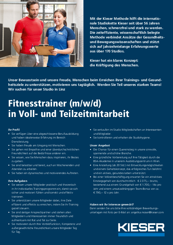 KIESER sucht Fitnesstrainer*innen in Linz (Voll- und Teilzeit)